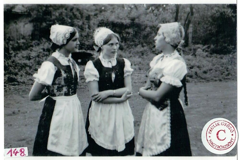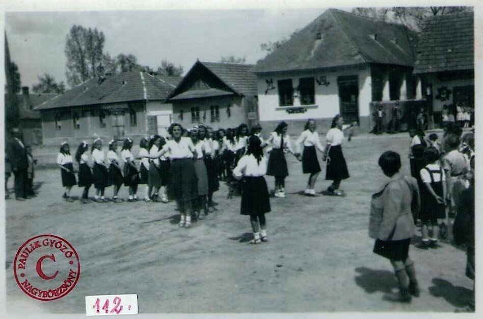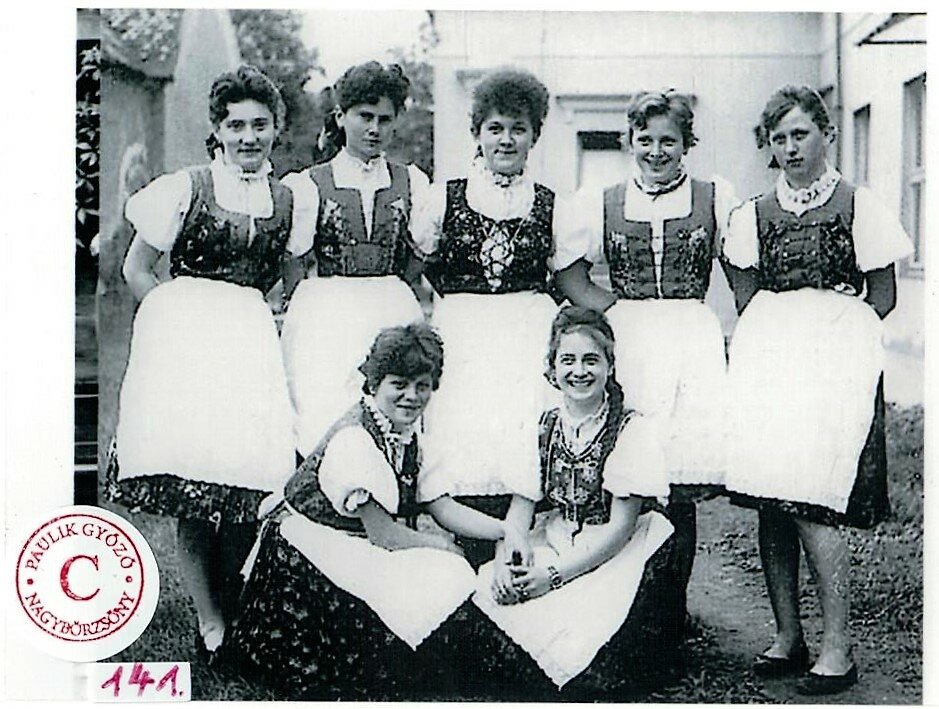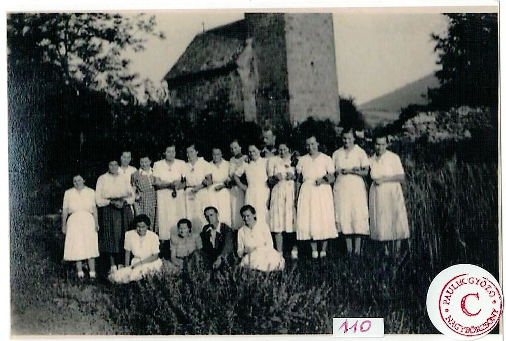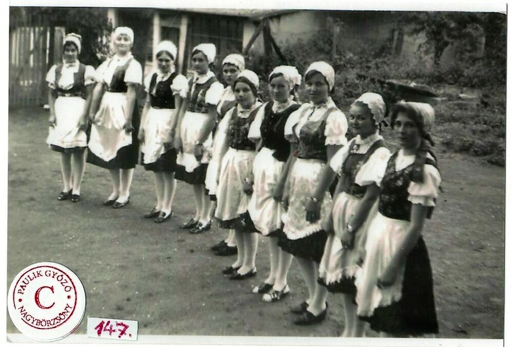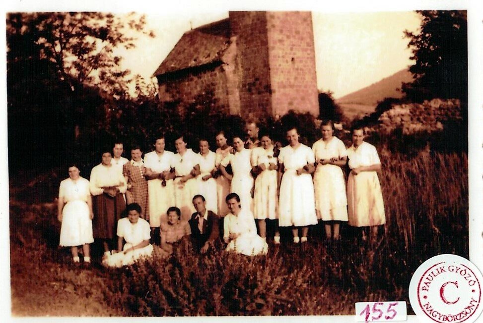 ( 155 ) - 1948 Aug. 20 - 16 tagú lány csoport, ének és tánc fellépés után , fényképezés Szent István templomnál. - Első sor,- Weisz Imréné Magdi- Szabó Ilona Fadgyas F né - x nevű Vámosmikolai férfi - Lukácsné - Álló sor.- Lehoczkyné - Szloboda Jánosné , Erzsébet anyja - Czáder Ilonka - Turján Anna - Lehoczky János első felesége - Scheider Anna - Glázer Gizella - Klein Margit - Weisz Mária - Weisz Katalin - id Paulik Győző - Balogi Neti - Makula Jánosné , Erzébet - x - ........ Irén - Több sorozat csoport beállítású felvétel készült . Exponálta id Paulik Győző VARIA fényképező géppel .