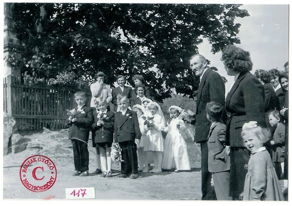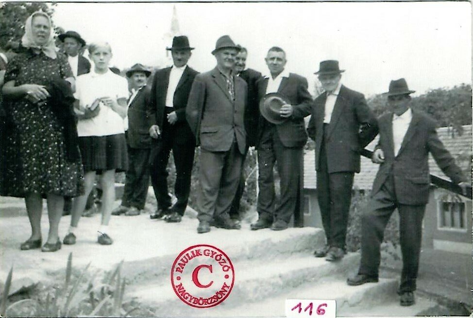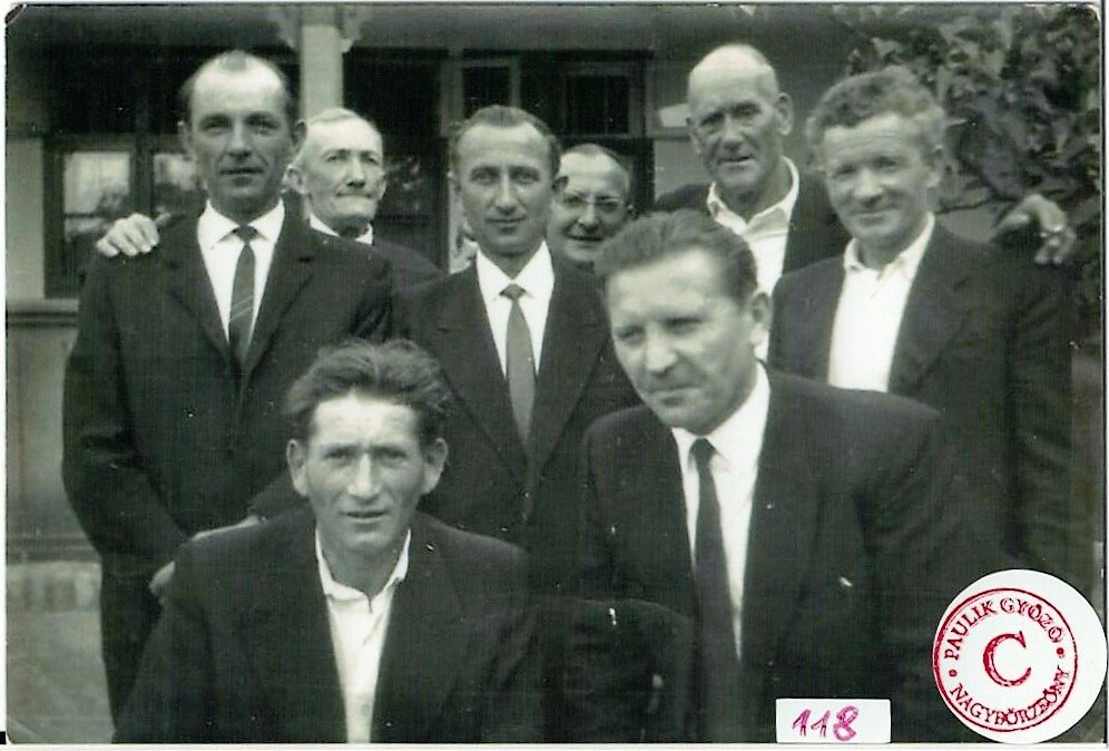 ( 118 ) - 1972 Május hónapban exponáltam a felvételt és forgalomba hoztam. - Elől.- Kólig Vilmos- Czáder József,- Hátsó sor.- Szabó József,-id. Gazdik János,- Weisz Imre, - Pintér József ,- Schmith István - id Horvát András - Szentmise után ,- Egyházi gyűlés előtt Exponáltam a felvételt .- Azon idő zónában 10.00 h kezdődött a Szentmise .- Dr Szappanyos Béla Plébános úr, Dísz ebéd fogadást adott , Katolikus Egyházi Bizottság tagjai részére . - Általam exponált - Fényképek másolatát , személyesen átadtam Dr Szappanyos Béla Plébános úrnak .Személyesen közölte velem , a Dísz ebéd fogadással kapcsolatos történteket .- Exponálta ifj Paulik Győző AGFA fényképező géppel .